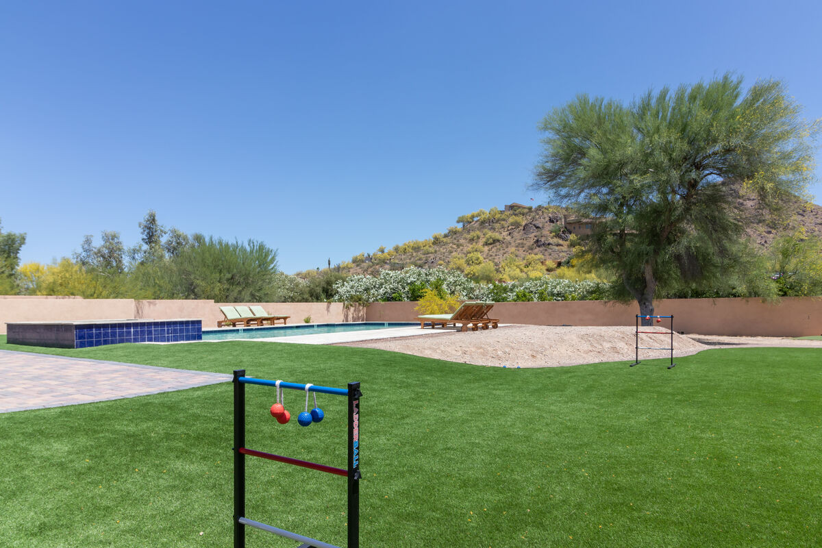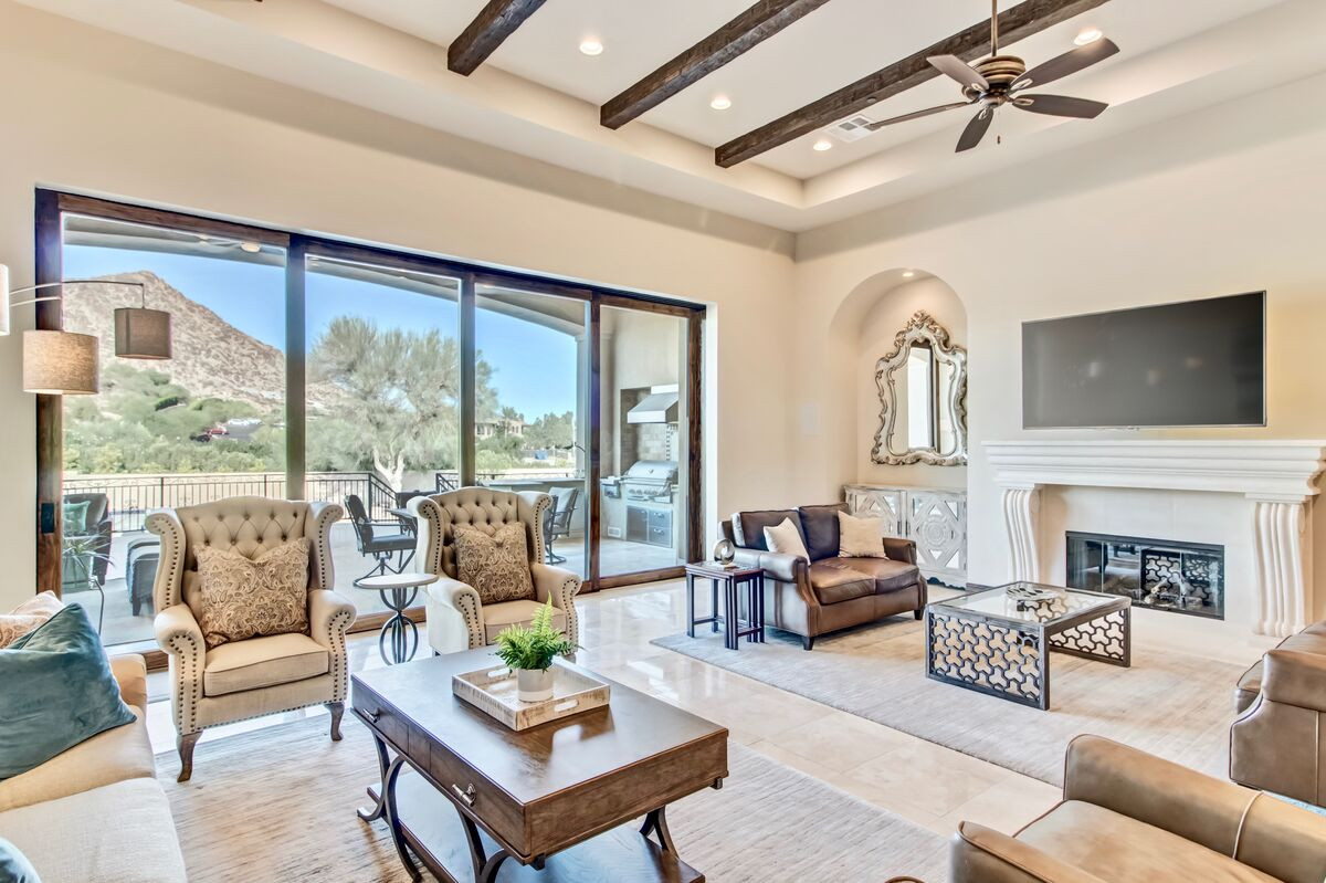 Enter the mansion through large ornate double doors and be amazed by the Enormous glass pocket sliding doors open nearly the entire length of the covered patio, providing an unobstructed view of the majestic mountains. Plush area rugs outline both of the sitting spaces inside the main living room. Exposed dark wood beams paint the sky-high ceilings with a fan to keep you cool. A regal fireplace, huge flat-screen TV, high-end furnishings, and grand arches make this space cozy, entertaining, and contemporary. Two dining room tables offer ample seating for your large group, with floor to ceiling windows ushering in an abundance of natural light.