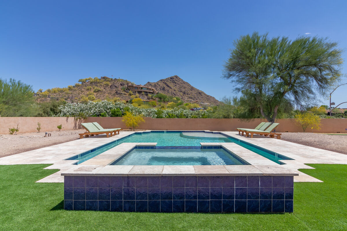 The open concept design seamlessly connects the main living room to the sleek tiled, outdoor patio. The expansive covered patio is an effortless extension of the home with many seating options, a deluxe grill and kitchenette, and a fire pit to keep you warm when star-gazing at night. Down a few stairs is the oversized, sparkling pool and spa lined by modern lounge chaises for sunbathing all day.
