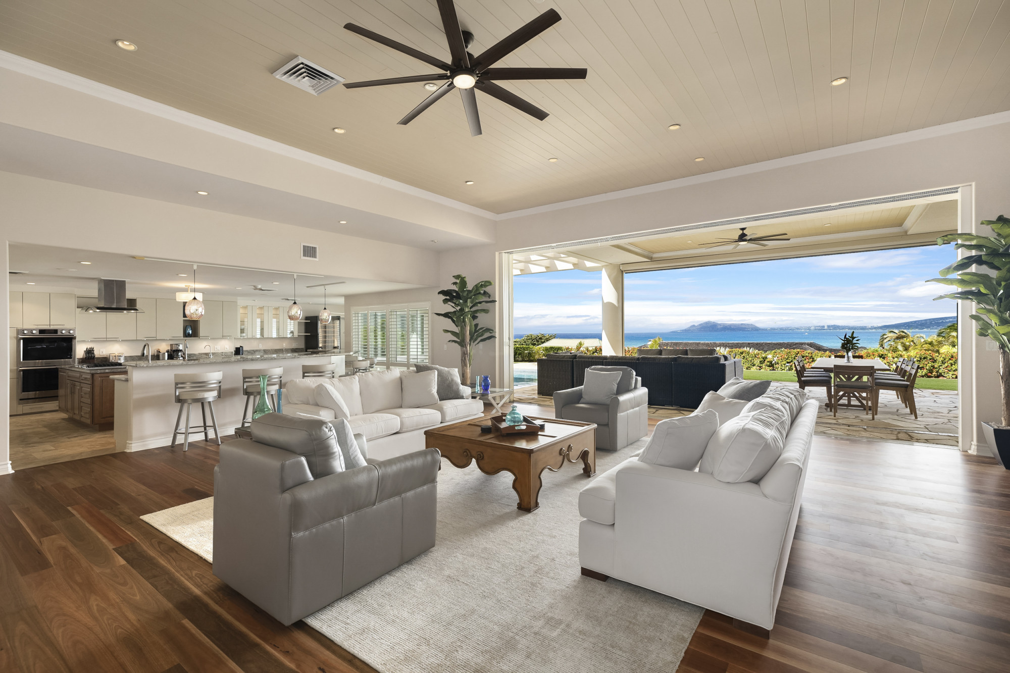 Open and inviting, the great room captures the feeling of gathering at the water's edge. Soaring ceilings, wide glass doors, and natural light create a breezy, modern aesthetic balanced by warm island textures. Plush seating invites conversation or quiet relaxation, while the adjacent dining area and media lounge flow easily to the lanai for sunset entertaining.