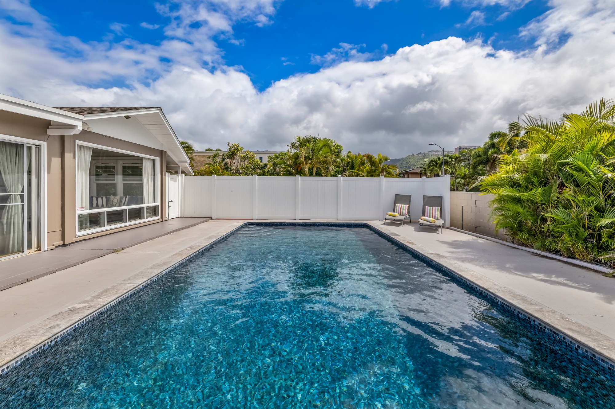 Outside, the pool area is a tropical haven, where you can take a refreshing dip or lounge in the warm Hawaiian sun. Fire up the BBQ grill and enjoy meals poolside, or pack up the provided beach gear and head to Kahala Beach, a nearby gem known for its tranquility and golden sands.