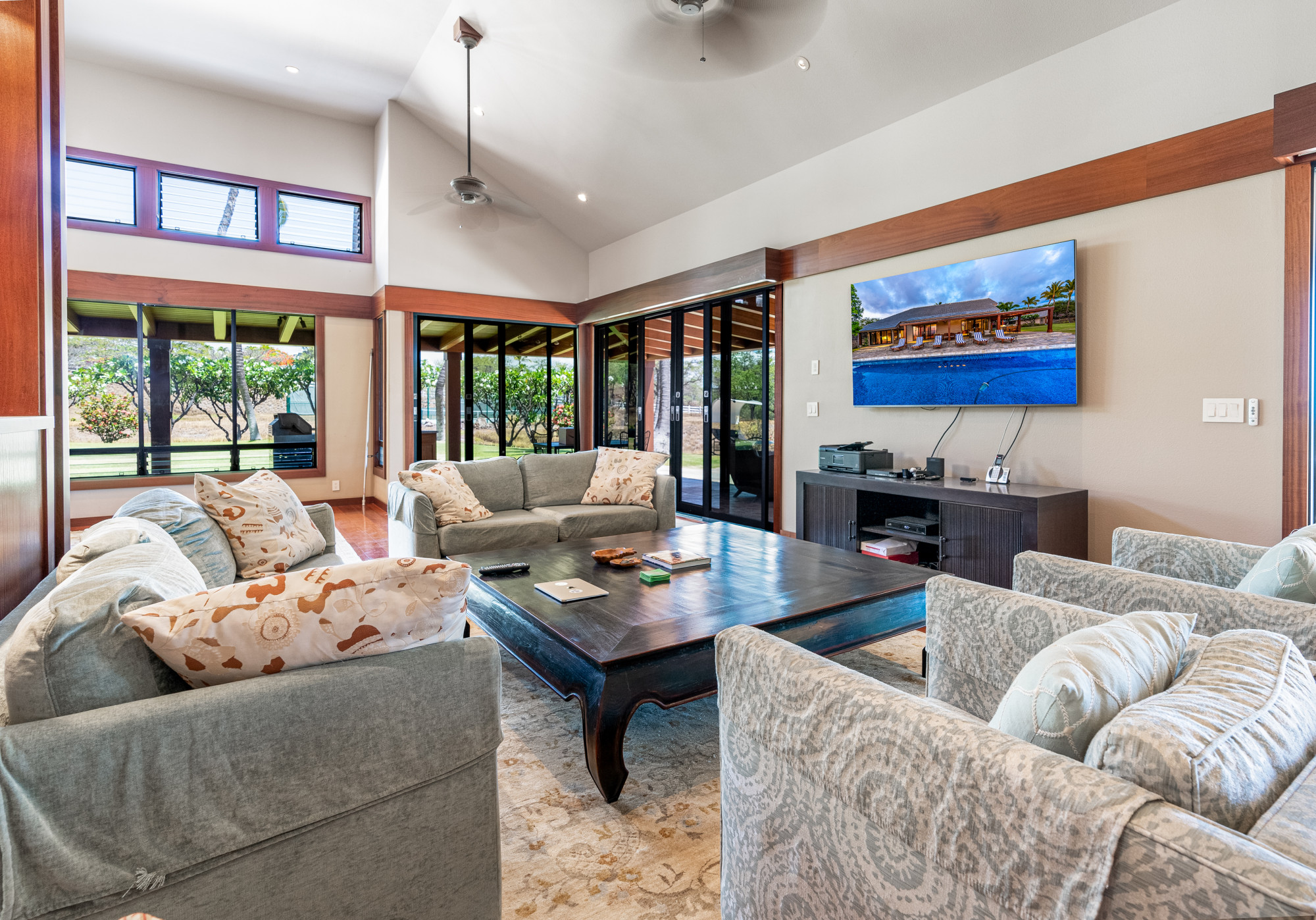 Enter Olomala Hale from the long circular driveway and Japanese inspired entrance to the incredibly spacious openly-designed common area that incorporates the gourmet kitchen, dining and living area with ample natural light as well as high-vaulted ceilings and ceiling fans for easy and breezy airflow throughout the space. The kitchen is outfitted with beautiful granite countertops and all stainless steel Miele appliances, a wine fridge, a large central island, and two breakfast bars with six bar stools for entertaining during mealtimes. The living area comes with comfortable chairs and couches to recline and enjoy your favorite shows on the large flatscreen television, while peering out towards the pool and ocean views. There is also a half-bath next to the common area as well and a private office for guests' convenience.