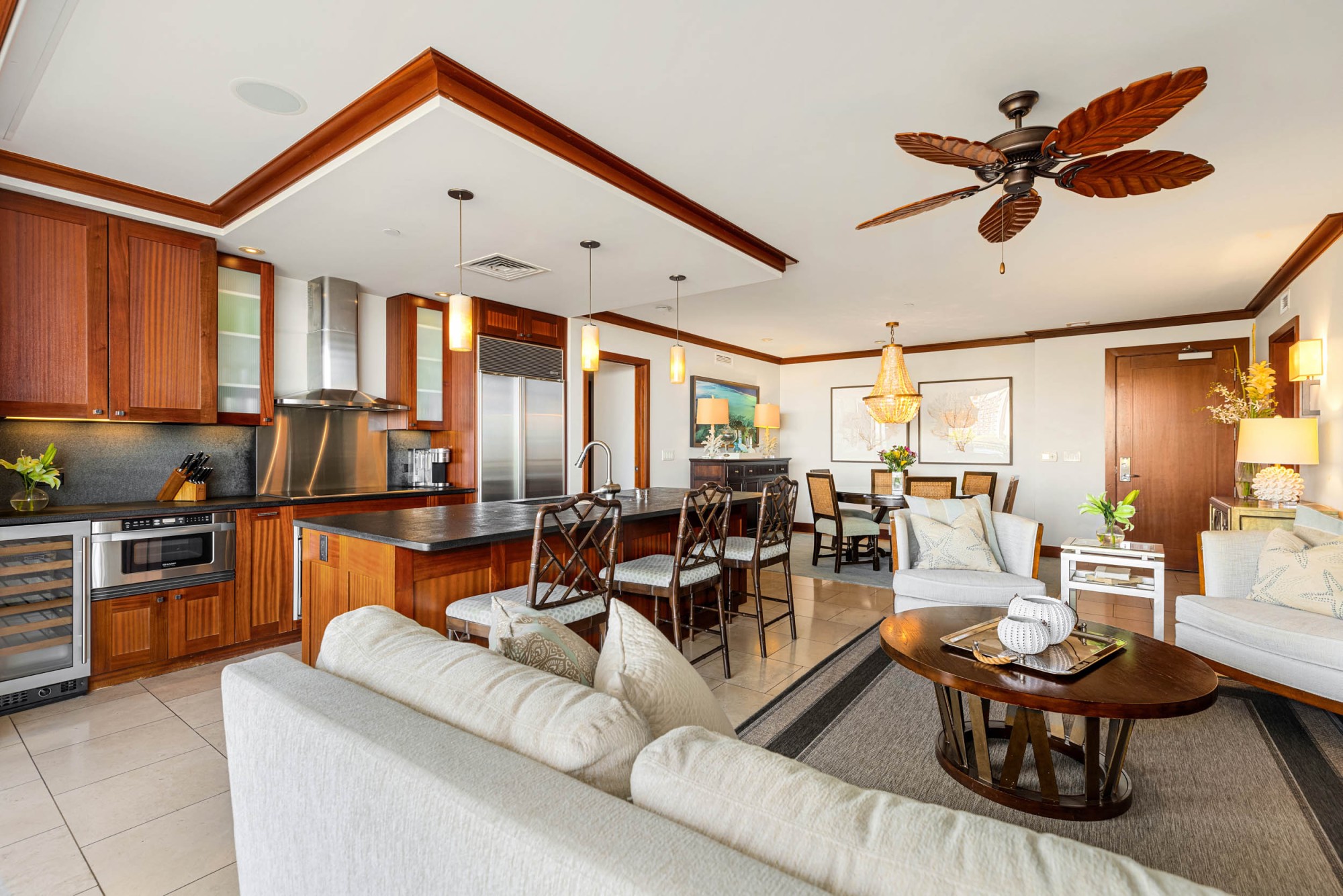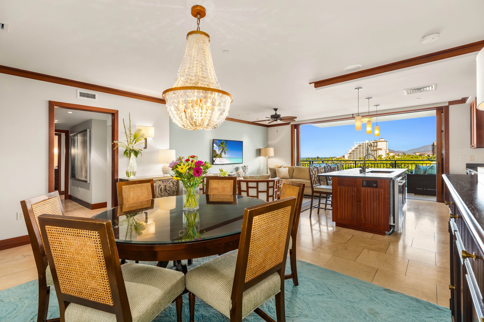 Step into the open-concept great room, where elegant design meets comfort. Floor-to-ceiling glass doors open to the lanai, creating seamless indoor-outdoor flow. Gather in the living room for sunset views, or enjoy dinner for six beneath the chandelier, surrounded by ocean blues and tropical light.