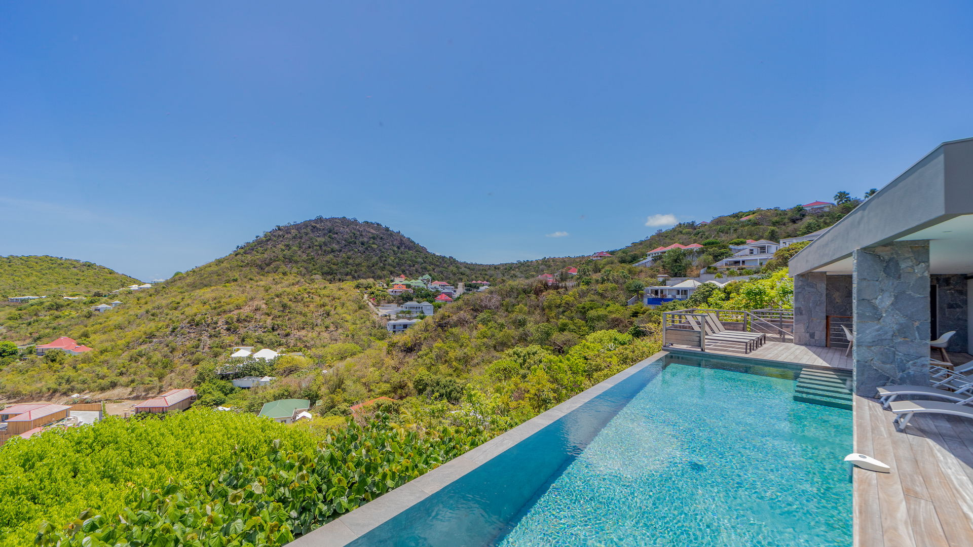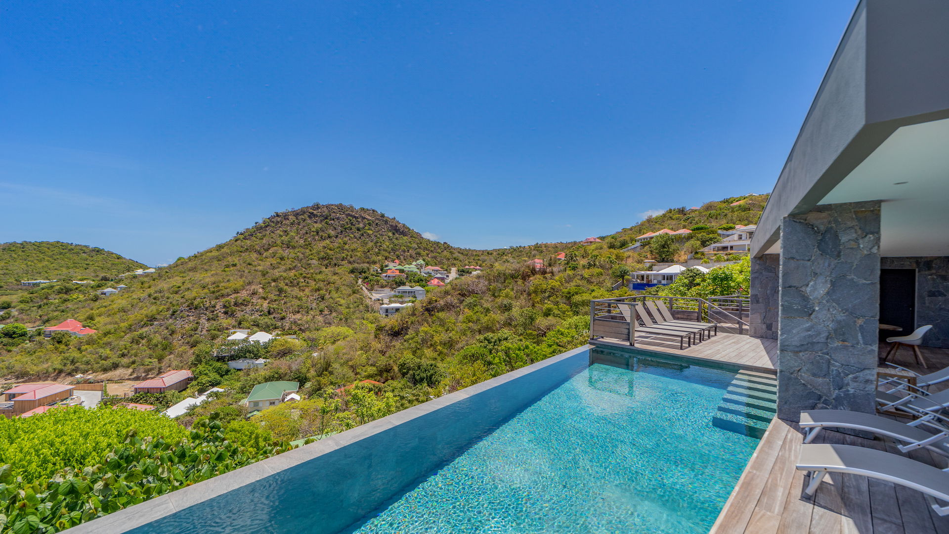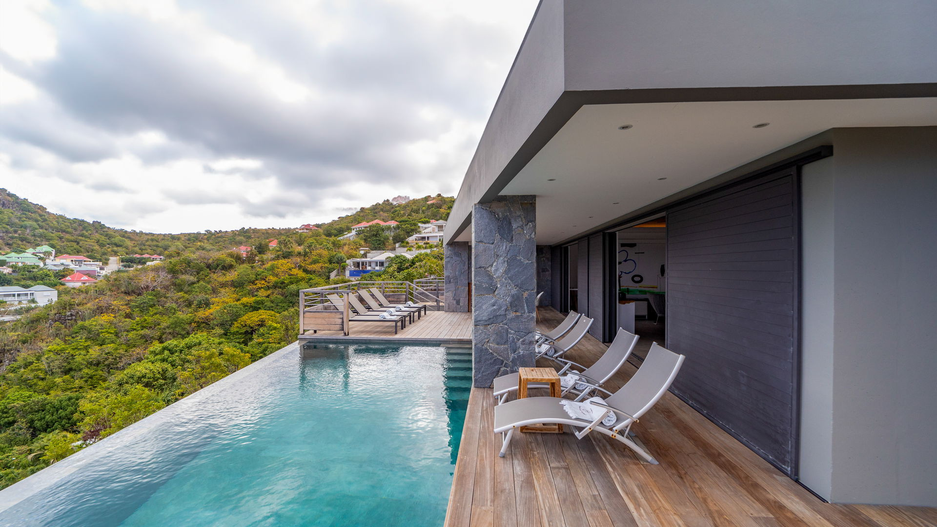 Outside, you'll enjoy the sumptuous infinity swimming pool (more than fifteen meters), facing the ocean and seemingly merging with the turquoise-colored waters. All around it, there are lounge chairs as an ideal setup to marvel at Saint-Barth's beauty, as well as a dining area nestled in the lush vegetation of the island.