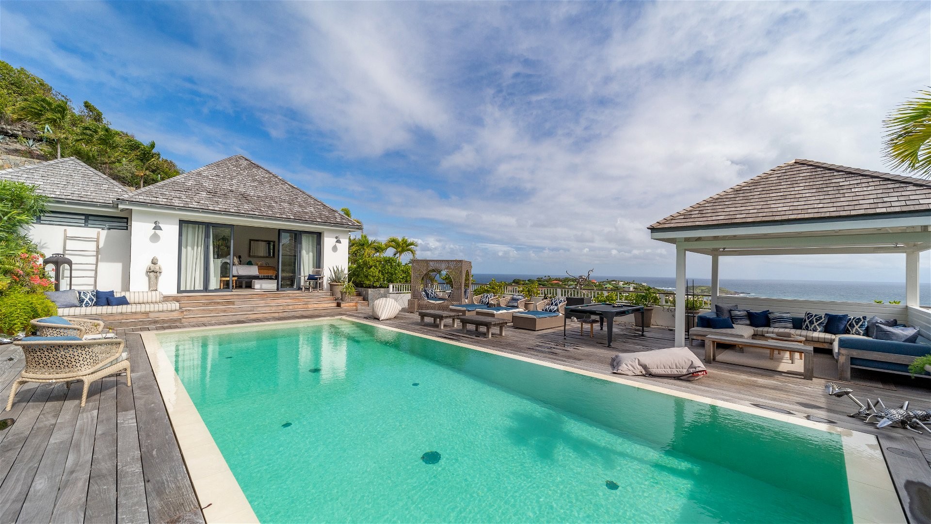 A few steps further down, the terrace, which can be accessed via an exterior staircase, is designed around the swimming pool surrounded by sunbeds. In front of the ocean view, this is the perfect place to marvel at the island's beauty. A daybed with woven fibers is also available, covered with cushions and blown by the gentle trade winds. At the end of the terrace, a gazebo furnished with an outdoor lounge welcomes guests in a very private atmosphere, close to the lush vegetation in front of the ocean view.