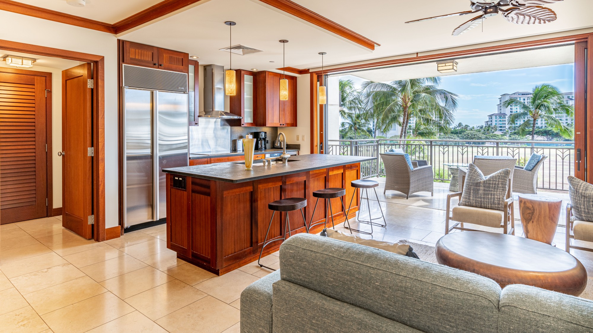 Located on the fourth floor of the Ocean Tower, this elegant three-bedroom, three-bathroom villa accommodates up to eight guests across 1,481 square feet of sophisticated island living. Overlooking the resort's serene pool and tropical gardens, with the Pacific Ocean glistening just beyond, this is your perfect Hawaiian retreat.