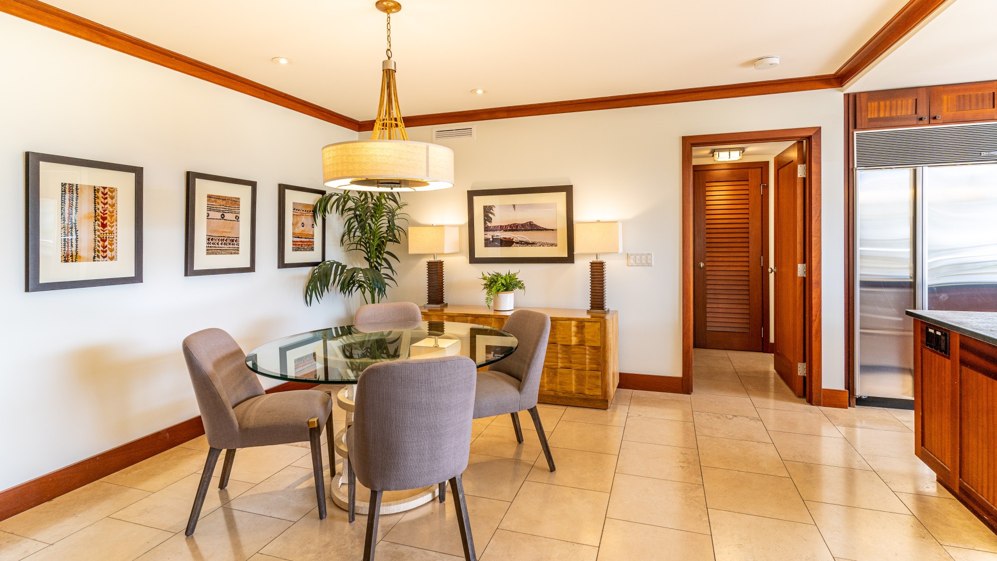 The spacious living area welcomes you with warm island decor and abundant natural light. Relax on the comfortable sofa or gather around the entertainment center for movie nights. The dining area seats six, making it ideal for shared meals after a day of exploring. Floor-to-ceiling sliding doors open to the private lanai, where you can enjoy sunrise coffees or sunset cocktails surrounded by tropical beauty.