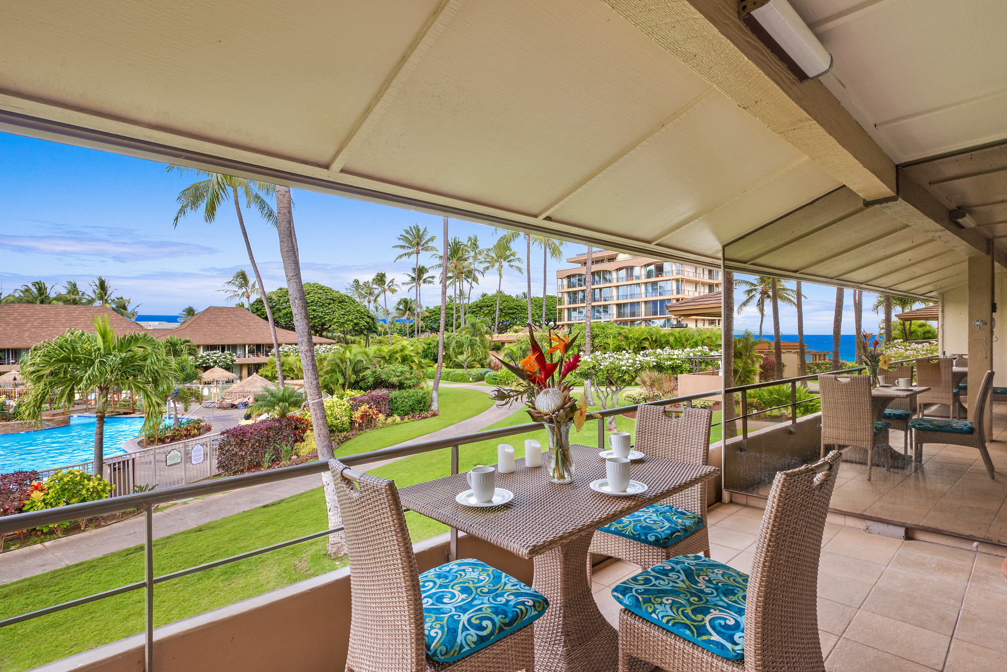The private lanai overlooks manicured gardens that lead to the resort pool and the sea beyond. Spend leisurely afternoons poolside, then grill dinner at one of the ocean-view BBQ stations and dine al fresco beneath Maui's starlit sky.