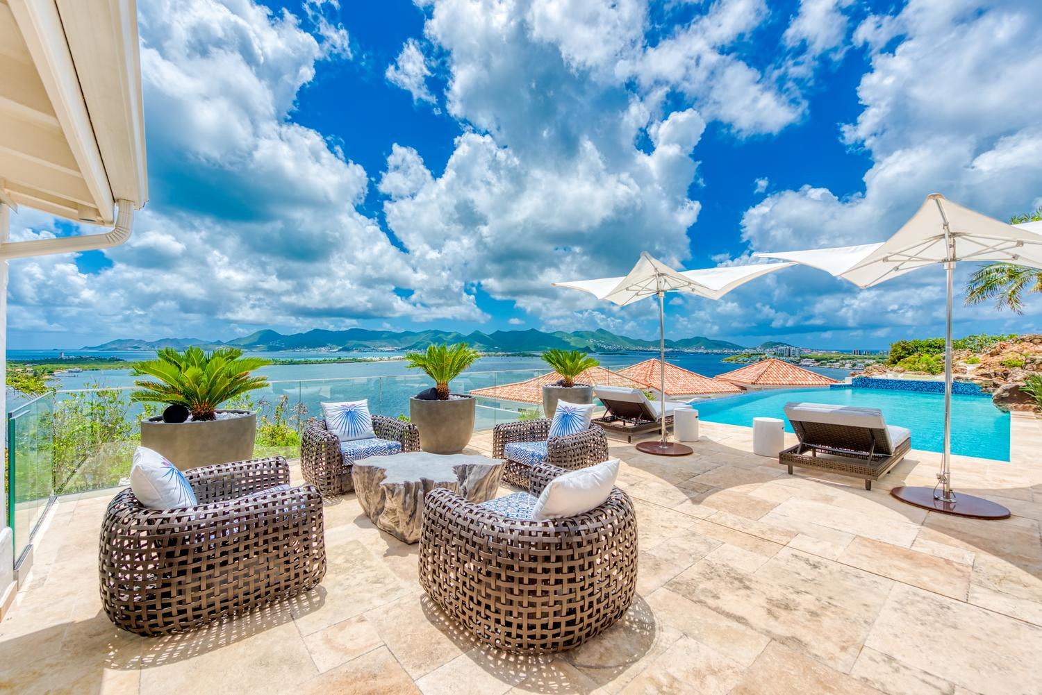 The stunning Villa Le Rocher is a five-bedroom jewel, it sits in the hills of the Terres Basses area of St. Martin and offers visitors stunning views of Simpson Bay as well as uninterrupted views of both the Atlantic and Caribbean.