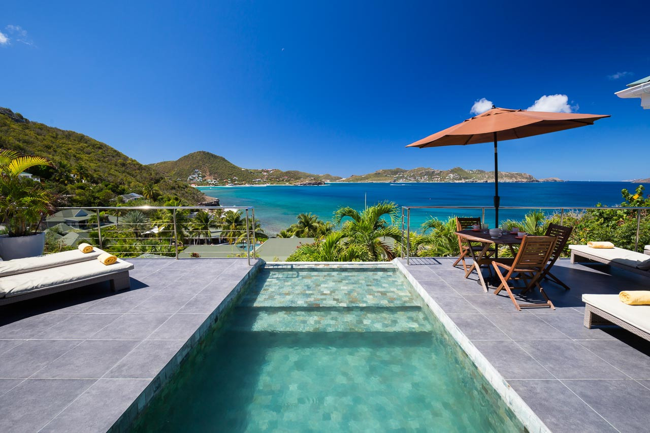 The living room opens to a large deck with plenty of loungers and a small plunge pool with infinity edge. The kitchen comes with modern amenities and an extra refrigerator. Both the living and kitchen areas can be air-conditioned when the shutters are closed.