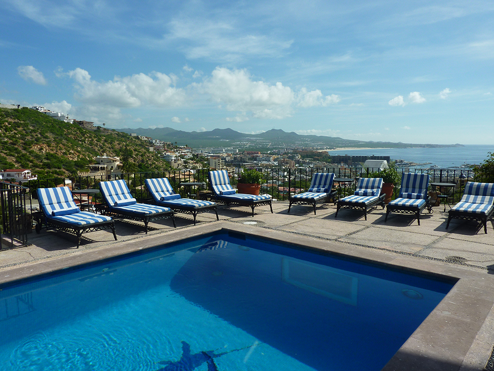 The private swimming pool is decorated with tiled whales and the sea scenery beneath its clear water. The spa is located on a lower level in the exercise area and overlooks downtown Cabo San Lucas.