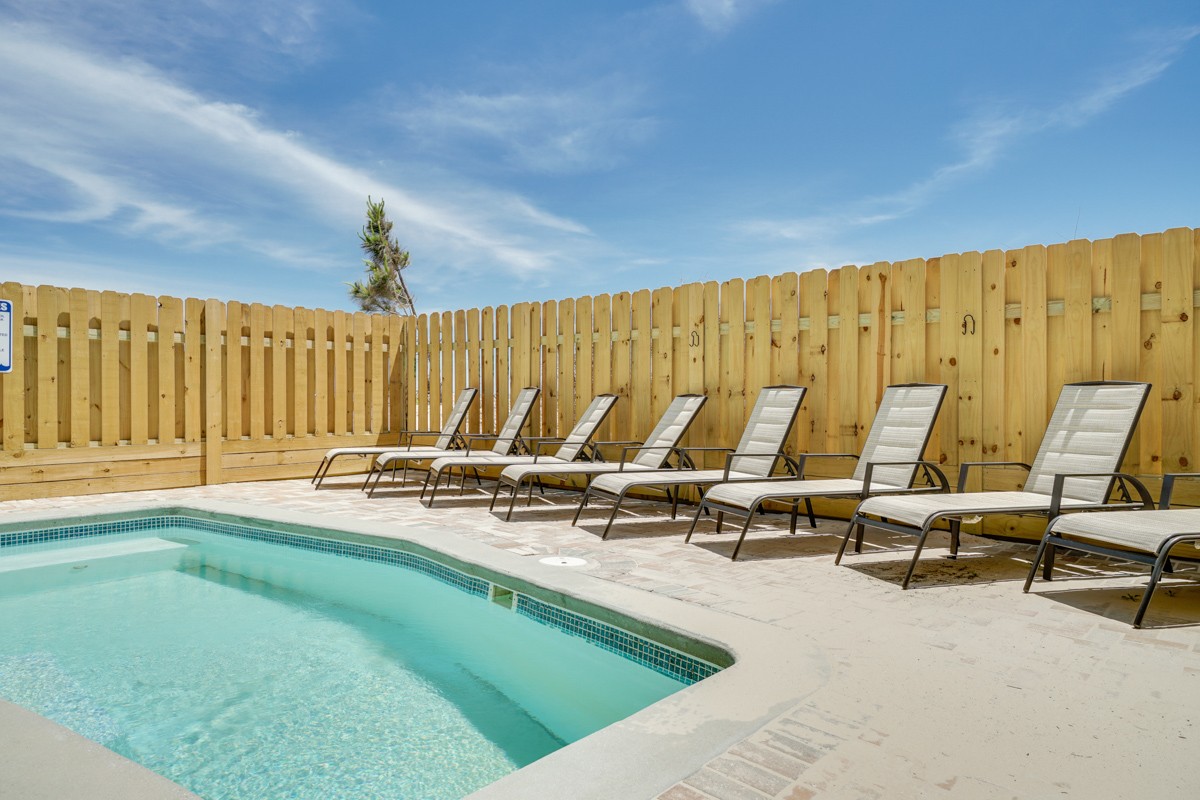 Adagio Beach is a pet-friendly ocean-front home with an elevator, screened-in porch, private beachfront heated pool, and 6 bedrooms including 4 King Gulf-front bedrooms, each featuring its own private bath and flat-screen TV. This home is spacious with more than 2,700 square feet plus 3 beachfront decks. It is situated forward of nearby houses, providing unobstructed views for miles down the beach. Beautifully decorated, it includes all housewares and electronics.