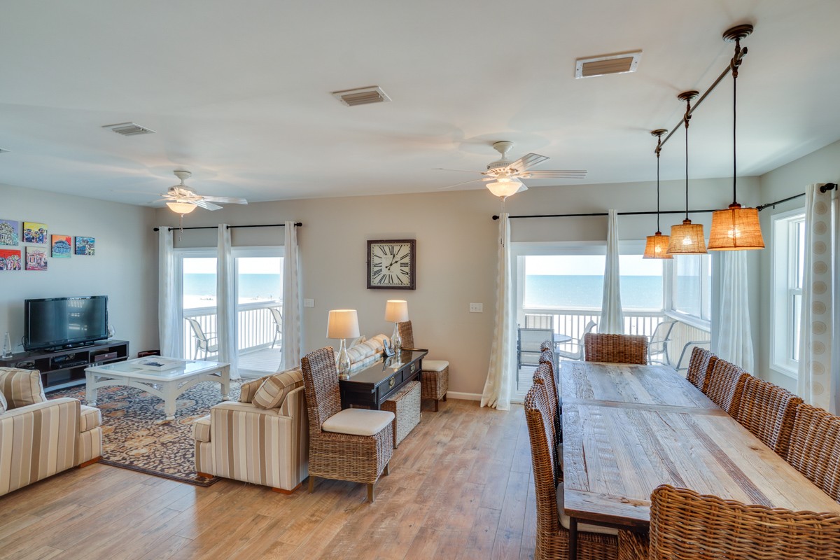 Beautiful extra large wood dining table seating up to 12. A fully equipped gorgeous kitchen with granite counter tops and beach view. The granite island with 4 stools is great for casual dining or communing during food preparation. A convenient half bath, laundry room with full sized washer and dryer plus second fridge located just off the kitchen. The fourth floor features 2 bedrooms, 2 baths, desk area. The 2 King Gulf-front bedrooms offer walkouts to beachfront deck. The master bath has double vanities and tiled shower. The second King bedroom has a private bath just outside the door. We are happy welcome up to 2 dogs for an additional non-refundable pet fee.